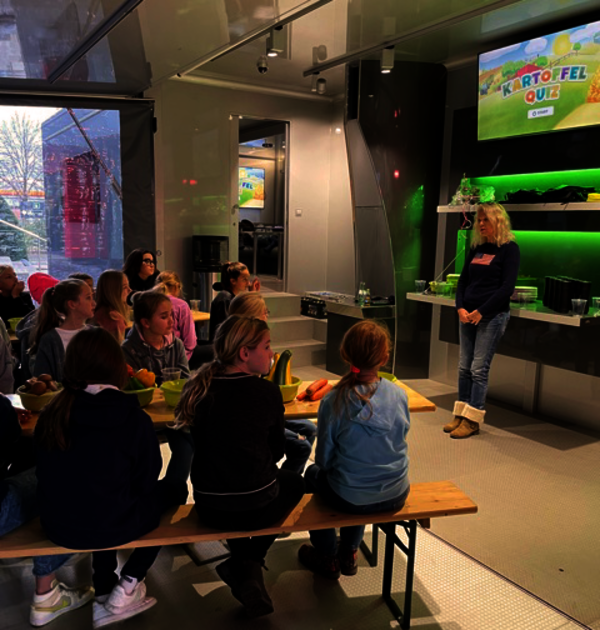 Unser innovatives Bildungskonzept, das multimediales Erleben und praktisches Lernen vereint, wird von unserem coolen Schulbrummi unterstützt. Auf ca. 70 qm² bietet er Platz für 16 Teilnehmer. Mit einem überdimensionalen Touch Screen und einer VR Brille tauchen sie ab in eine 3-D Erlebnislandwirtschaft und vertiefen anhand von interaktiven Aufgabenstellungen ihr Wissen. Er fährt jedoch auch mal ganz gerne raus aufs Feld um die Schulungsmitglieder aktiv in den Anbau, die Bearbeitung oder die Ernte mit einzubinden.