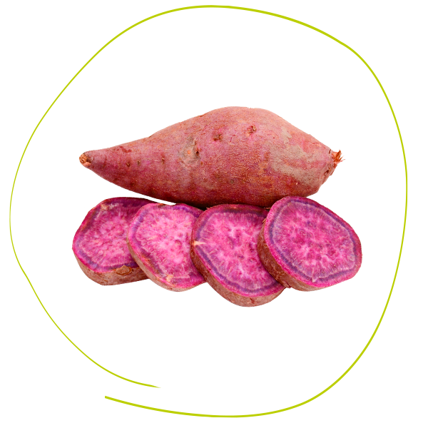 Die intensiv violette Färbung des Fruchtfleischs der Purple Flesh-Süßkartoffel ist nicht nur optisch ansprechend, sondern verleiht den Gerichten auch eine einzigartige visuelle Dimension. Sie zeichnet sich durch einen süßen und erdigen Ge-